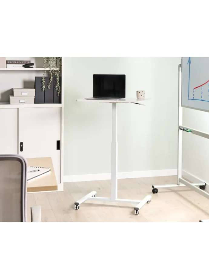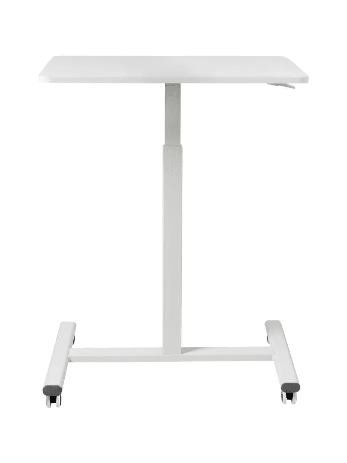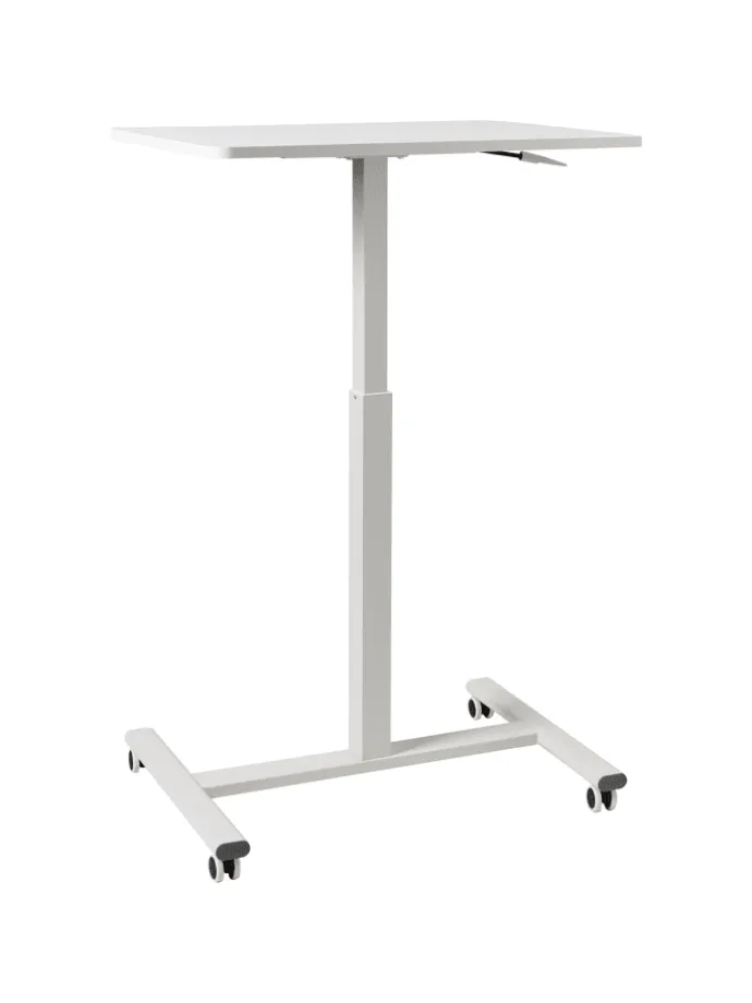 Manuell höhenverstellbarer Laptophalter in Weiß. Vereinfachen Sie Ihren Arbeitsalltag mit diesem kompakten, höhenverstellbaren Laptoptisch. Er verfügt über eine elegante, weiße Tischplatte und einen stabilen, passenden Metallrahmen. Die verstellbare Höhe ermöglicht ein müheloses Wechseln zwischen Sitzen und Stehen, während die Rollen für ein einfaches Verschieben sorgen. Eine moderne, platzsparende Lösung für einen flexiblen und ergonomischen Arbeitsplatz – ideal, um Funktionalität und Stil in Ihrem Homeoffice zu vereinen.