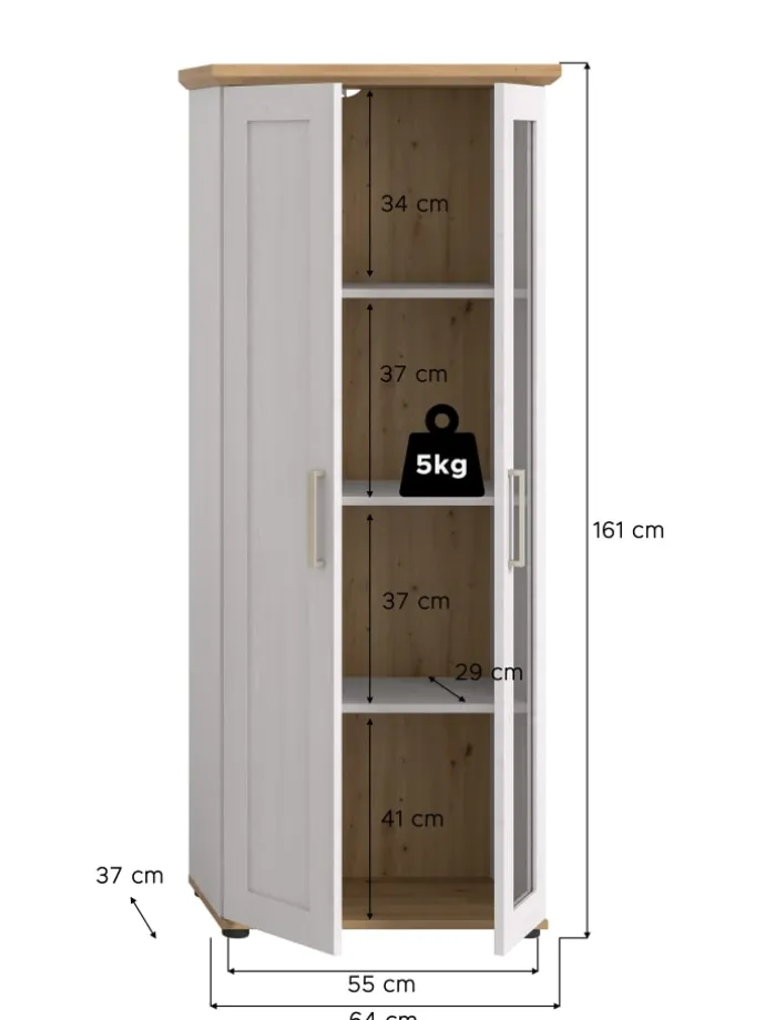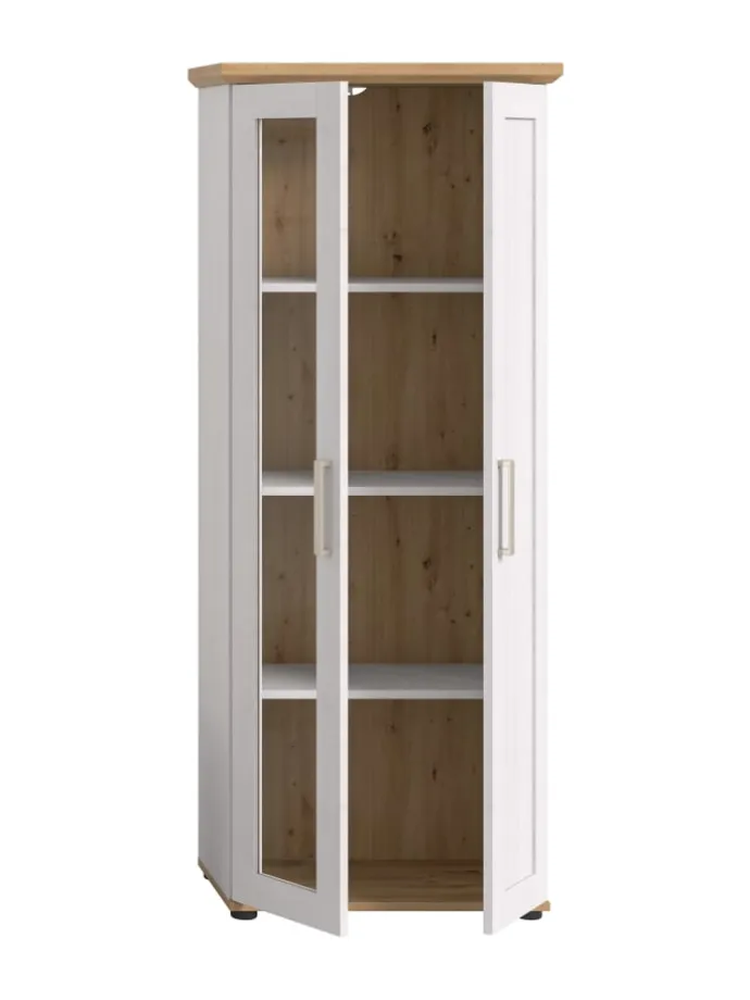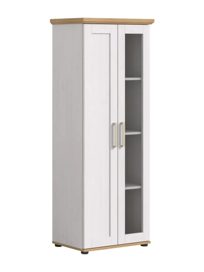 Präsentieren Sie Ihre Lieblingsstücke stilvoll in unserer eleganten Vitrine im Landhaus-Look! Ausgestattet mit einer Holztür und einer Glastür sowie drei herausnehmbaren, höhenverstellbaren Einlegeböden und vier Fächern, bietet sie sowohl Stauraum als auch eine ansprechende Präsentationsfläche. Der farblich abgesetzte Ober- und Unterboden rundet das moderne Design ab.
