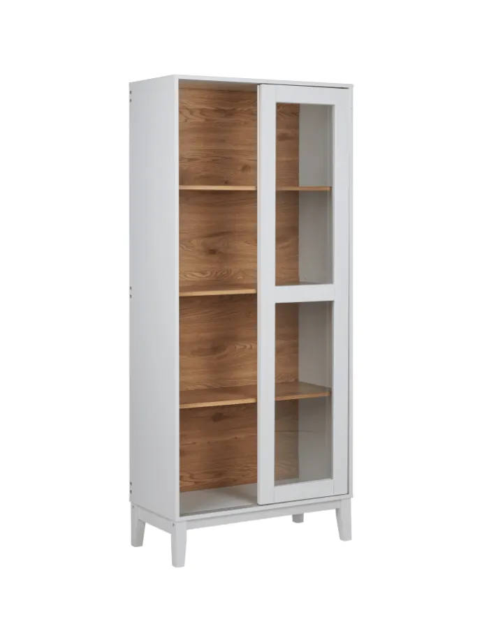 Klassischer, weißer Vitrinenschrank mit Glasschiebetüren. Diese stilvolle und praktische Vitrine ist die perfekte Ergänzung für jedes Esszimmer oder Wohnzimmer. Der Schrank besticht durch sein schlichtes Design mit Glasschiebetüren und eleganten Holzbeinen, und lässt sich leicht in verschiedene Einrichtungsstile einfügen. Er bietet reichlich Stauraum, darunter Einlegeböden für jegliches Geschirr, und ist sowohl funktional als auch elegant. Präsentieren Sie Ihr feines Porzellan, Ihre Gläser oder Sammlerstücke hinter der klaren Glastür und verleihen Sie Ihrem Raum einen Hauch von Eleganz, während Ihre Gegenstände staubfrei und leicht zugänglich bleiben.
