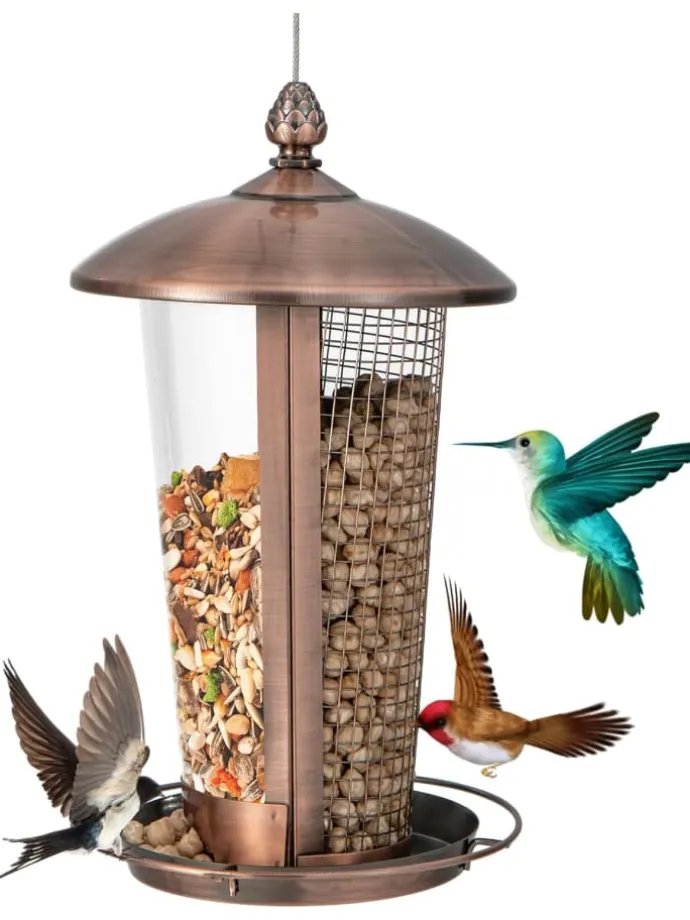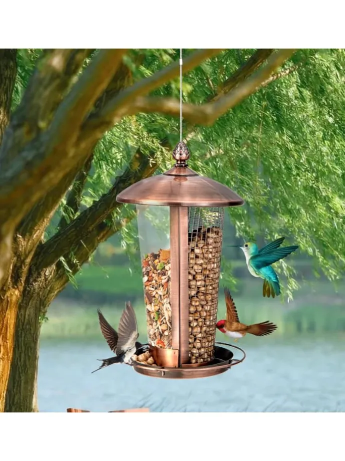 Unser 2-in-1-Vogelfutterhaus zum Aufhängen im Freien wird mit 2 Röhren geliefert, die Samen unterschiedlicher Größe aufnehmen können, um Vögel wie Kardinäle, Spottdrosseln, Meisen, Stieglitze, Drosseln usw. anzulocken. Außerdem besteht es aus hochfestem, gespritztem Metall und durch die Verwendung eines rostfreien Edelstahldrahts kann der Futterspender für Wildvögel bei unterschiedlichem Wetter verwendet werden. Und mit dem erhöhten runden Tablett können mehrere Vögel gleichzeitig ihr Futter genießen. Wenn es leer ist, müssen Sie nur noch den Deckel öffnen und neues Saatgut nachfüllen. Sie können ihn je nach Bedarf an den Baum, die Traufe oder eine Säule hängen.