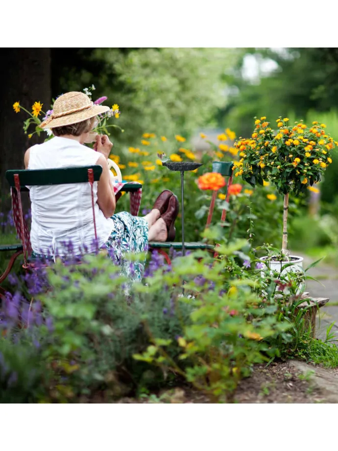 Erfreue Dich am Anblick von Spatzen, Meisen, Finken und anderen Wildvögeln, die diese Vogeltränke besuchen. Das Vogelbad kann frei im Garten in der Erde platziert werden und ist auch ohne tierische Besucher ein echtes Deko-Highlight. Der Gartenstecker im Blatt-Design ziert den sonst schlichten Stab. Das in die Wasserschale eingearbeitete Blattmuster gibt Vögeln einen guten Halt beim Baden und Trinken. Die wetterfeste Vogeltränke aus robustem Gusseisen kann das ganze Jahr über draußen bleiben.