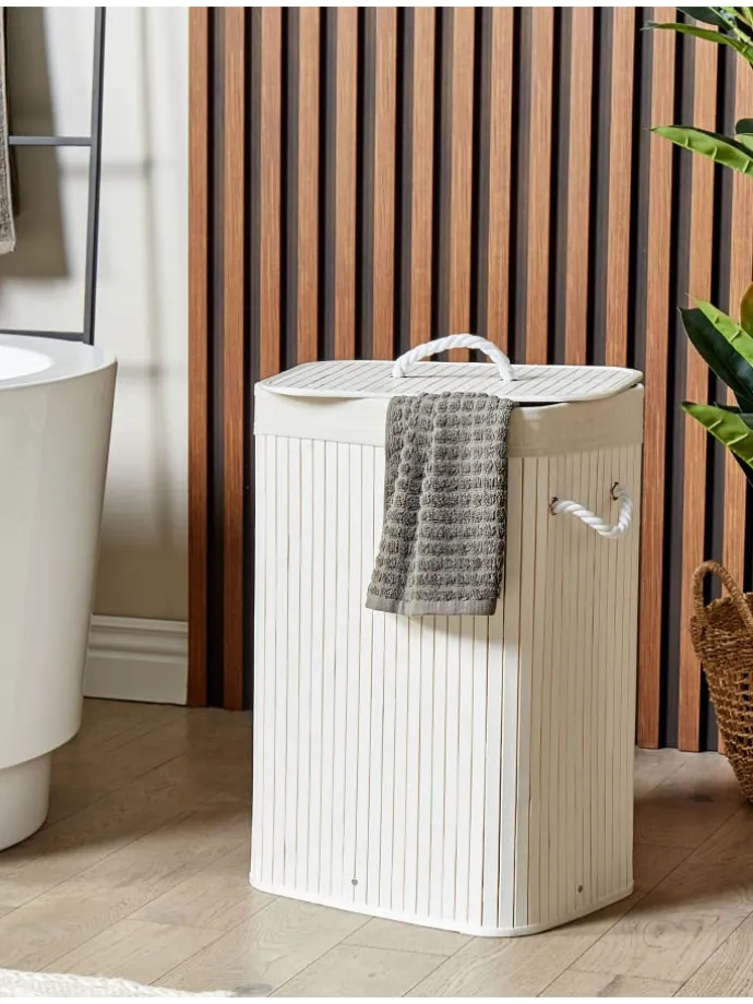 Moderner, handgefertigter Wäschekorb mit Deckel und Wäschesack. Kompakt und praktisch – so lässt sich diese Wäschetonne beschreiben. Sie ist aus hochwertigem Bambusholz gefertigt und zeichnet sich durch eine solide Konstruktion und ein einfaches, aber ästhetisches Design aus. Zudem ist der Wäschekorbsammler handgefertigt und verfügt über einen herausnehmbaren Stoffeinsatz sowie einen passenden Deckel. Der Holzkorb eignet sich hervorragend zur diskreten und geruchsfreien Aufbewahrung Ihrer Wäsche. Außerdem können Sie ihn auch im Schlaf- oder Kinderzimmer plazieren und nicht nur als Wäschesammler, sondern auch für die Aufbewahung von vielen anderen Dingen wie z. B. Kleidern, Tagesdecken oder Kinderspielzeugen nutzen. Die seitlichen Griffe werden den Transport bis hin zur Waschmaschine bestimmt erleichtern.
