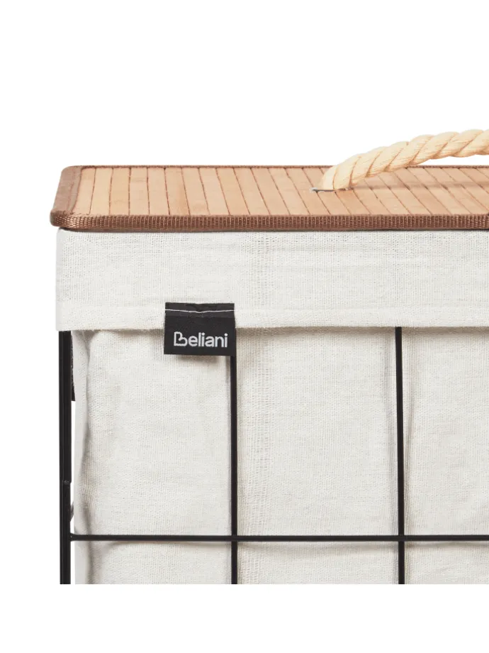 Badezimmer Wäschekorb mit Deckel und Wäschesack. Dieser elegante Wäschekorb verbindet Funktionalität mit minimalistischem Design. Er besteht aus robustem Metall und ist innen mit Stoff gefüttert, der die Wäsche optimal durchlüftet. Der Bambusdeckel verleiht dem Korb einen natürlichen Touch und ist abnehmbar, so dass man leicht darauf zugreifen und ihn reinigen kann. Dieser Korb ist ideal für moderne Badezimmer oder Waschküchen und vereint auf einfache Weise Haltbarkeit und Eleganz.