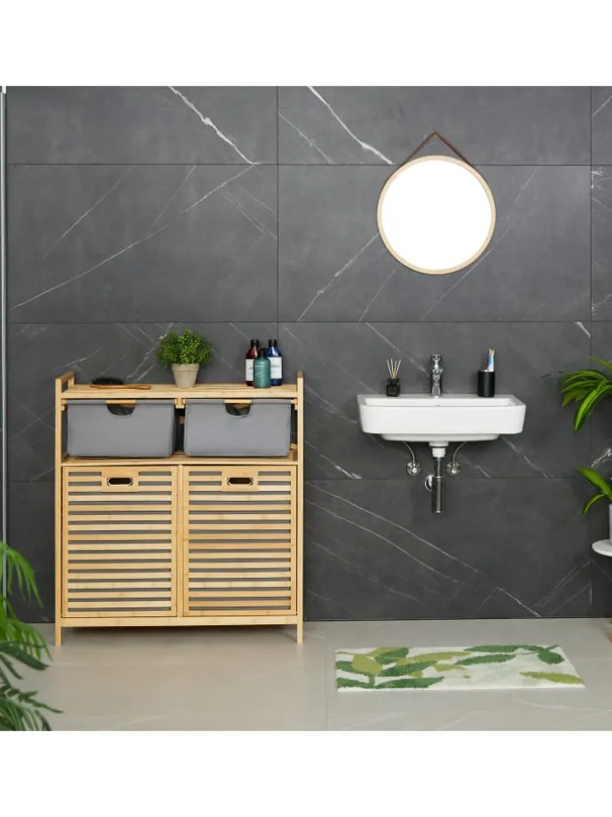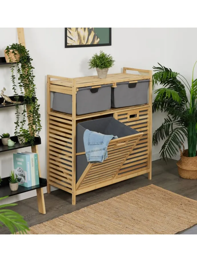 Dieser Wäschesammler mit großer Ablage ist das perfekte Möbelstück für das Badezimmer. In den 2 kippbaren Wäschetruhen verstaust Du Deine Schmutzwäsche bereits vorsortiert bis zum nächsten Waschgang. Die Ablagefläche eignet sich ideal zum Aufbewahren von Handtüchern, Waschmittel oder auch Dekoartikeln, während 2 Stoffschubladen weiteren Stauraum bieten. Optisch überzeugt das Wäschekorbregal mit seiner Fertigung aus Bambus, die ein Stück Natürlichkeit in Dein Bad bringt.