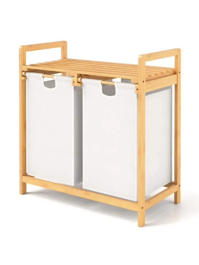 Er besteht zu 100% aus natürlichem Bambus, ist stabil, langlebig und sehr sicher. Die zwei Wäschesäcke dienen zum Sortieren von weißer und bunter Wäsche, außerdem können sie leicht herausgenommen und zur Waschmaschine getragen werden. Auf der Oberseite können zudem Waschmittel, Weichspüler, Fleckenentferner, Handtücher oder andere Gegenstände abgestellt werden. Auch kann man dort Wäsche zusammenlegen. Dank der Griffe ist das Tragen einfach.