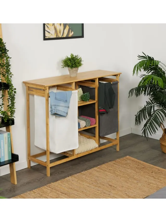 Verstaue Deine Schmutzwäsche ordentlich bis zum nächsten Waschgang. Zwei ausziehbare Wäschekörbe ermöglichen das diskrete Aufbewahren und Vorsortieren Deiner Schmutzwäsche. Gleichzeitig wird Dir durch die eine große und 3 kleine Ablagen zusätzlicher Stauraum für Handtücher, Waschmittel und mehr geboten. Das moderne Design und der Materialmix aus Bambus und Stoff-Wäschesäcken machen die praktische Kombination aus Wäschesortierer und Badregal zum Hingucker in Deinem Schlaf- oder Badezimmer.