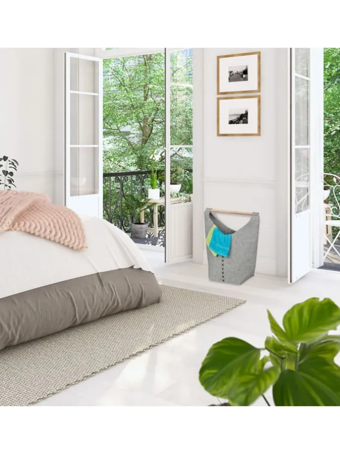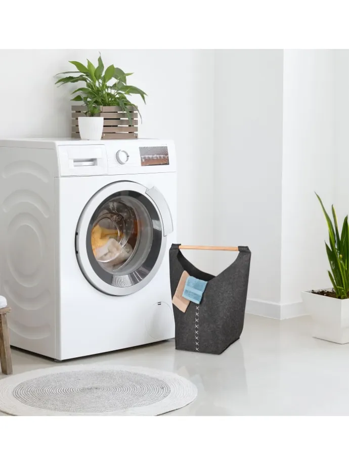 Hol Dir mit diesem Filzwäschekorb ein praktisches und stilvolles Accessoire für Dein Zuhause. Der moderne Wäschekorb bietet ausreichend Platz für Deine Schmutzwäsche im Bad, Kinder- oder Schlafzimmer. Dank des Holzgriffs kannst Du die Wäschetasche bequem und mühelos zur Waschmaschine und zurück transportieren. Dabei überzeugt der Wäschesack auch optisch mit seiner dekorativer Schnürung. Wenn Du ihn nicht benötigst, kann er einfach zusammengefaltet und flach im Regal oder Schrank verstaut werden.