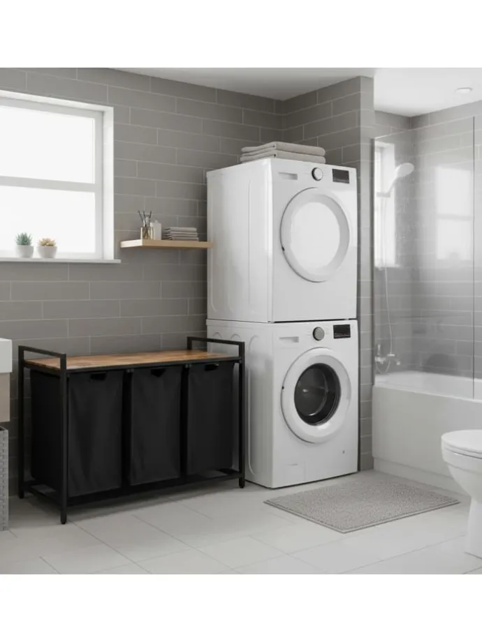 Verstaue Deine Schmutzwäsche ordentlich bis zum nächsten Waschgang. Der Wäschesammler mit drei herausnehmbaren Wäschesäcken ermöglicht ein bequemes Vorsortieren von dunkler, heller und bunter Wäsche. Die stabile Ablagefläche in Holzoptik bietet zusätzlichen Platz für Waschmittel, Handtücher oder Deko. Dank des robusten Metallrahmens und der abwaschbaren Stoffsäcke überzeugt der Wäschekorb mit Langlebigkeit und Funktionalität. Ein praktischer Ordnungshelfer für Bad, Schlafzimmer oder Waschküche.