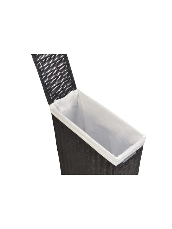 Hochwertiger Wäschesammler aus Rattangeflecht, handgeflochten, farbig lackiert. Stabiles Gestell aus Eisen, unten mit schwarzen Kunststofffüßen. Deckel aufklappbar, darunter Stauraum, der mit einem cremefarbenen Stoffeinsatz (35% Polyester/65% Baumwolle) bestückt ist. Vorne mit einem praktischen eingearbeiteten Griff. Der Wäschesammler wird montiert angeliefert. Maße ca. cm: (B/H/T) 16/59/39. Ideal für kleine, schmale Nischen.