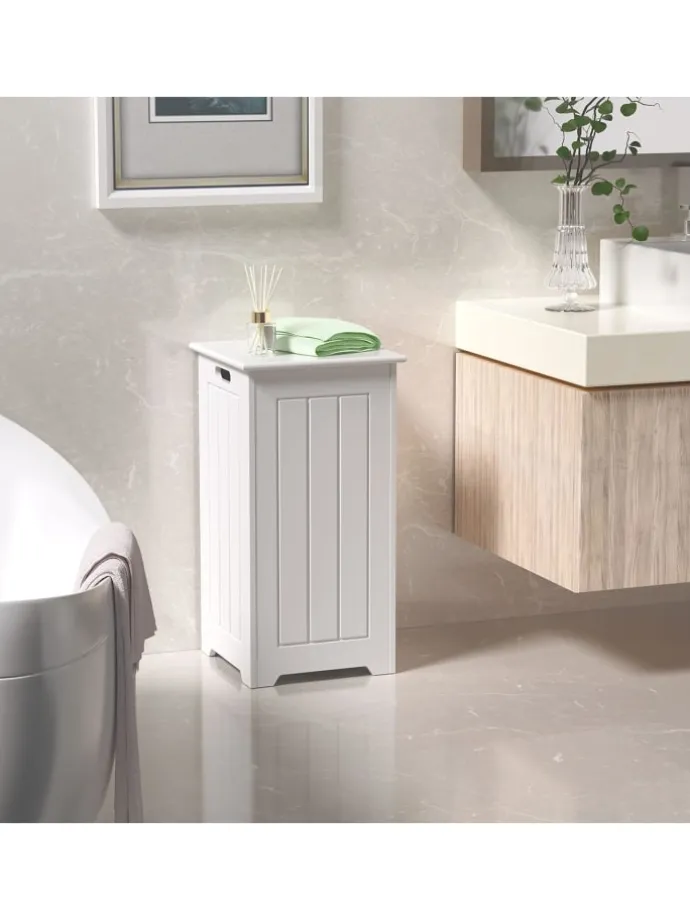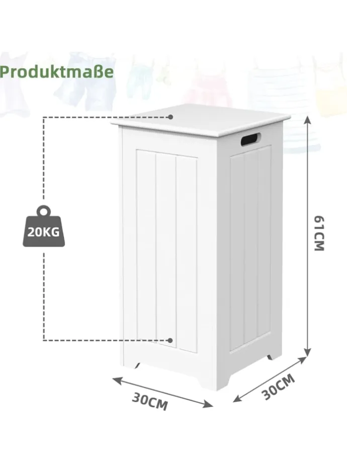 Dieser freistehende Schrank besteht aus MDF-Platten und ist daher sehr stabil. Sowohl die Oberseite als auch der Schrank können jeweils 20kg tragen. Zudem schützen die Füße vor einem direkten Bodenkontakt und damit vor Schäden durch Feuchtigkeit. Der Stauraum ist je nach Bedarf für Spielzeuge, Schmutzwäsche und andere Dinge nutzbar. Über die zwei Griffe kann er leicht zur Waschmaschine getragen werden. Durch sein modernes Design passt der Schrank zu allen möglichen Einrichtungen.