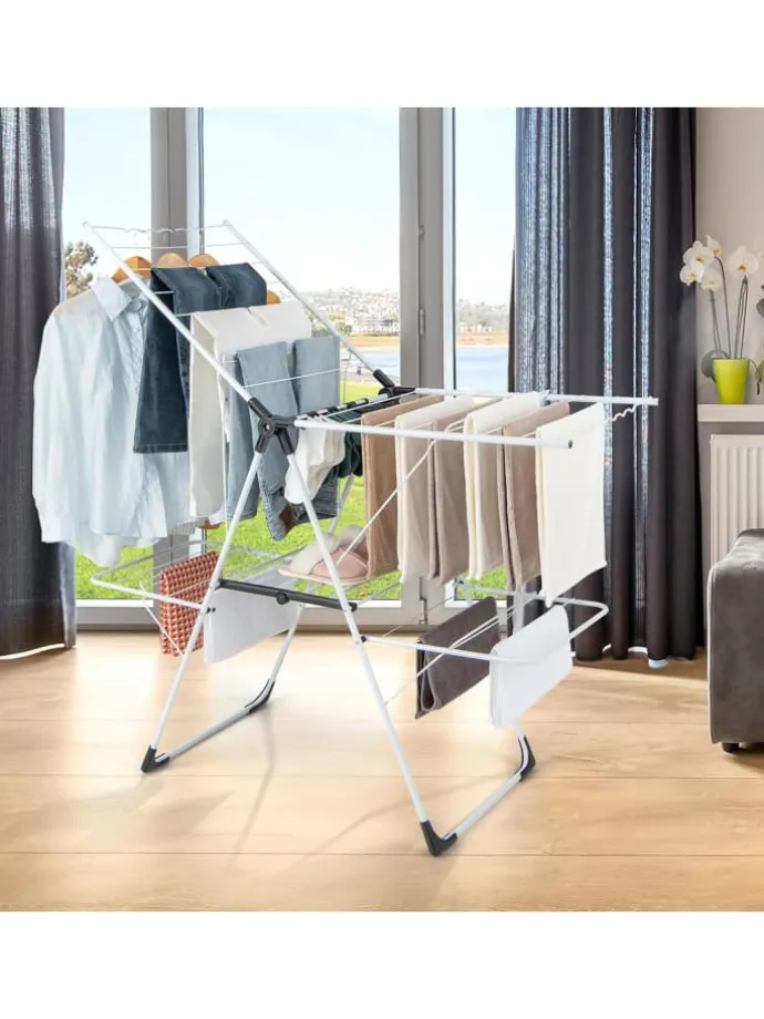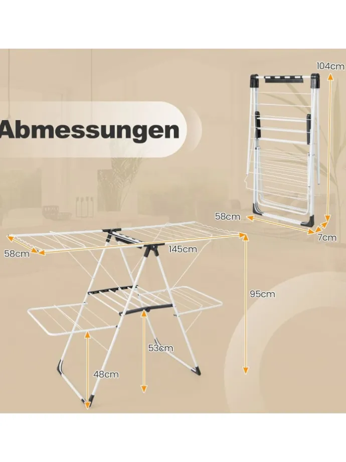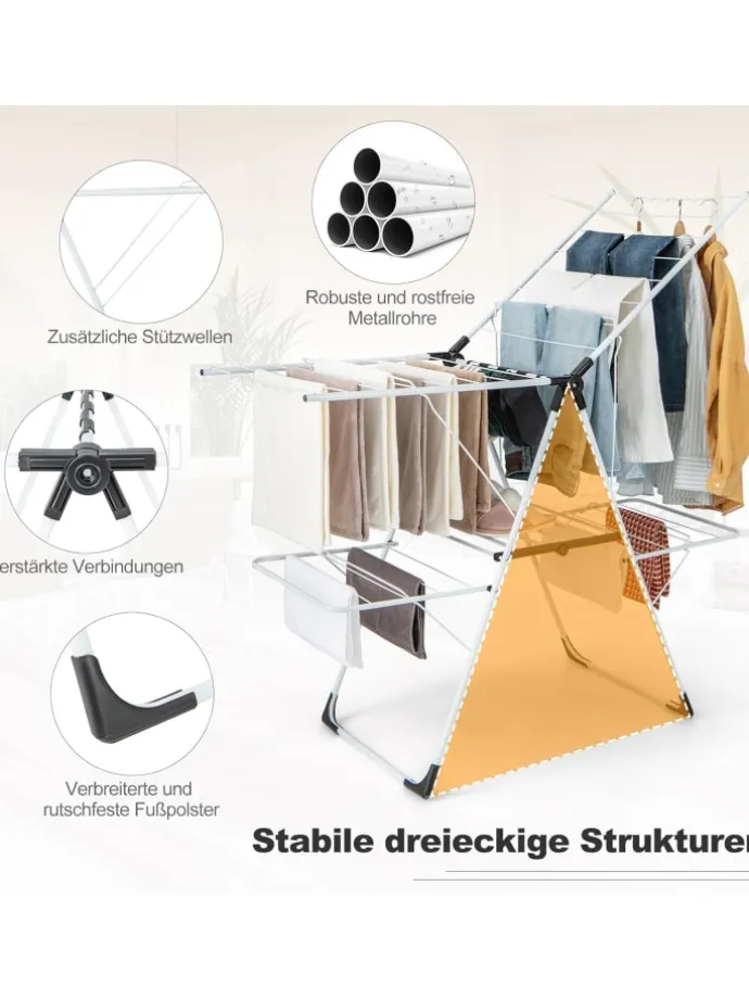 Der Wäscheständer verfügt über höhenverstellbare Flügel mit einem maximalen Abstand von 142 cm zum Boden, sodass Sie Kleidung unterschiedlicher Länge aufhängen können. Mit 2-stufigem Trockenraum, wellenförmiger Stange und Sockenclips ist genug Platz für verschiedene Arten von Kleidung. Noch wichtiger ist, dass der Abstand von 8,5 cm für eine gute Belüftung und schnelles Trocknen sorgt. Der klappbare Wäscheständer besteht aus langlebigen und robusten Metallrohren und ist auf Langlebigkeit ausgelegt. Die goldenen dreieckigen Strukturen und festen Verbindungen sorgen für allgemeine Stabilität. Zum Schluss bleibt zu sagen, dass Sie diesen freistehenden Wäscheständer je nach Bedarf leicht zusammen- oder auseinanderfalten können.