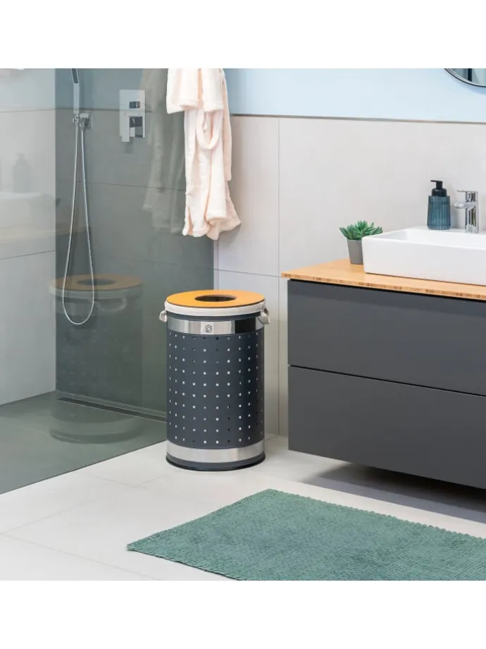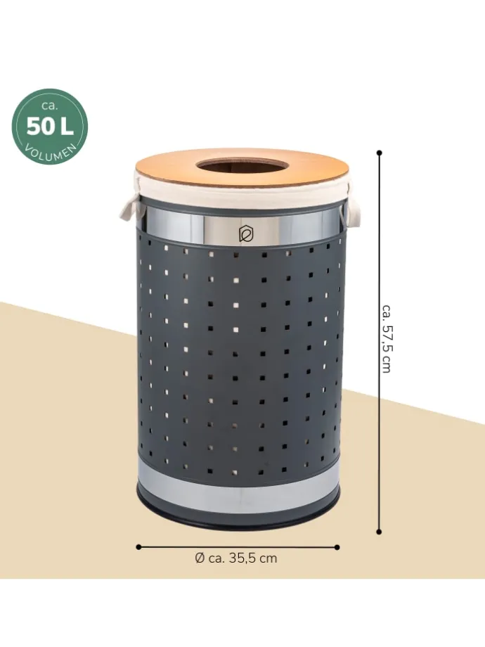 Die eluno Wäschetonne mit einem Volumen von 50 Litern und einem herausnehmbarem Stoffsack ist die perfekte Lösung für Ihre Wäscheaufbewahrung. Die Belüftungslöcher sorgen immer für adäquate Luftzirkulation und verhindern unangenehme Geruchs- und Schimmelbildung. Der moderne Deckel in Holzoptik verleiht der Tonne ein ansprechendes Design, während die hochwertigen Materialien für Langlebigkeit und Stabilität sorgen.