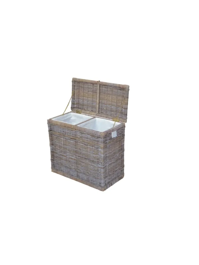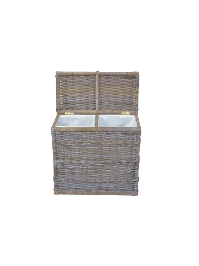 Praktischer Wäschesammler mit 2 Kammern. Gestell aus Massivholz Pinie, mit Rattan handgeflochten. Rechts/links mit praktischer, eingeflochtener Griffmuschel. Unter dem aufklappbarem Deckel sind 2 Kammern für Schmutzwäsche. Innen jeweils mit einem herausnhembarem Stoffeinsatz ausgestattet. Stoffeinsatz beigefarben (65% Baumwolle/35% Polyester). Ideal für die Trennung von Wäsche. Maße innen je Kammer ca. cm: B. 28 x T. 28 x H. 51 cm. Gesamtmaße ca. cm: B. 69 x T. 37 x H. 61 cm. Lieferbar ist der große Wäschesammler in 4 trendigen Farbausführungen: beigefarben gebeizt und lackiert, weiß lackiert, braun gebeizt und lackiert und naturgrau lackiert