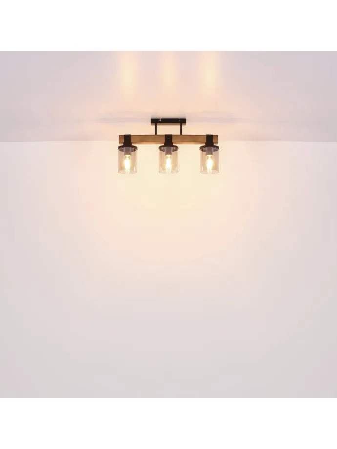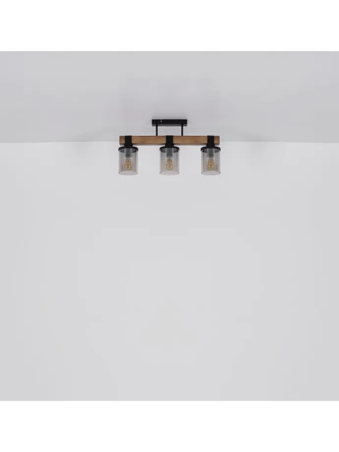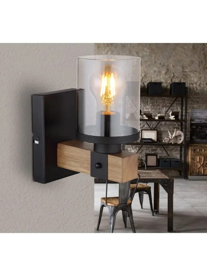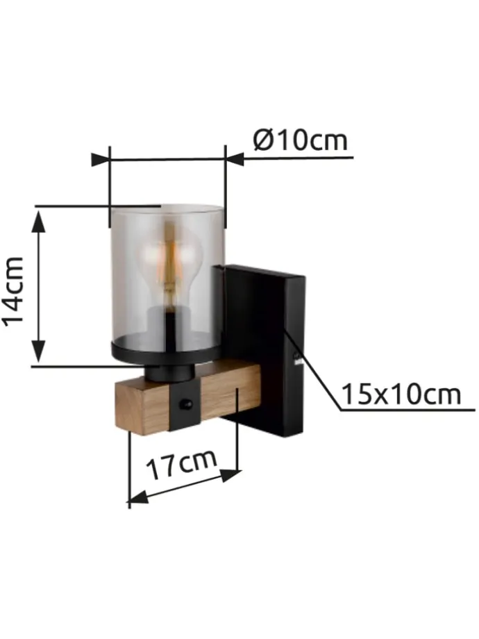 Wandleuchte Metall schwarz matt, Holz dunkelbraun, Glas rauchfarben, Richtung Lichtschein: aufwärts, BxH: 100x225mm, AL: 170mm, exkl. 1x E27 60W 230V
