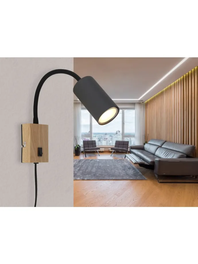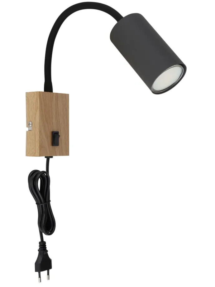 Wandleuchte Metall holzoptik, Kunststoff schwarz, Metall Graphit, Kabel PVC Schwarz, Wippschalter am Artikel, Flexo, BxH: 70x440mm, AL: 320mm, Kabellänge 1500mm, exkl. 1x GU10 25W 230V