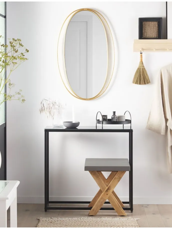 Ovaler Wandspiegel mit goldenem Rahmen. Dieser Spiegel ist ein echter Hingucker an Ihrer Wand. Sein goldener Rahmen zieht alle Blicke Ihrer Gäste auf sich und die ovale Form steht für klassischen und eleganten Stil – ein Must-Have in Ihrem Zuhause. Das Wohnaccessoire verbindet gleichzeitig Schlichtheit mit Eleganz und präsentiert sich perfekt sowohl im Eingangsbereich, als auch im Bad.