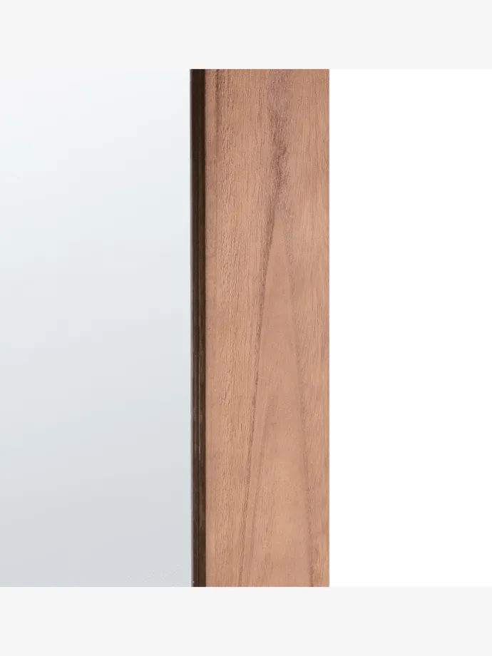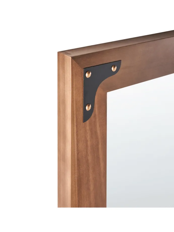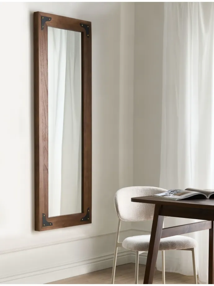 Standspiegel mit Holzrahmen. Dank seines handgefertigten Holzrahmens verleiht dieser hohe Wandspiegel jedem Raum traditionelle Eleganz. Die natürliche braune Farbe in Kombination mit stilvollen schwarzen Akzenten an den Ecken macht ihn zur perfekten Ergänzung für verschiedene Räume – vom rustikalen Wohnzimmer bis zum minimalistischen Schlafzimmer. Er vereint optische Eleganz mit Funktionalität: Integrierte Haken ermöglichen eine einfache Wandmontage und der hochwertige Rahmen garantiert lang anhaltende Schönheit. Ob Sie vor dem Ausgehen noch einmal Ihr Outfit überprüfen oder einen Raum heller und größer wirken lassen möchten, dieser Spiegel ist eine ausgezeichnete Wahl.