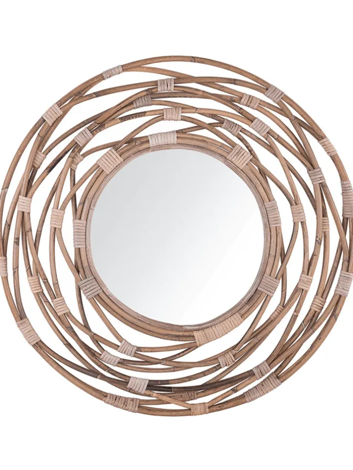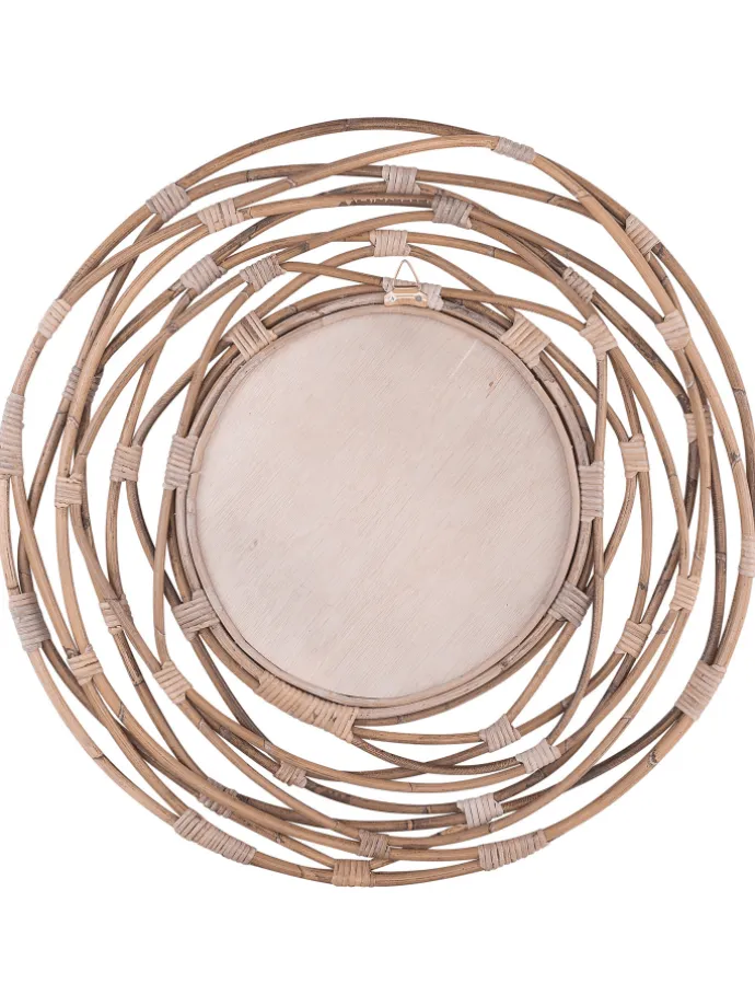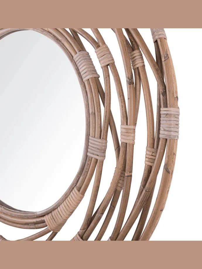 Einzigartiger Wandspiegel aus Rattan mit rundem Rahmen. Überraschen Sie Ihre Gäste mit diesem originellen Spiegel aus Rattan. Die geflochtene Form des Rahmens verbindet Eleganz und Raffinesse und wird dadurch ein echtes Highlight in Ihrem Wohnambiente. Der außergewöhnliche Look passt perfekt zu Räumen mit Vintage- oder Boho- Charme.