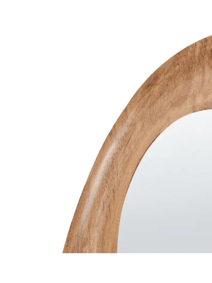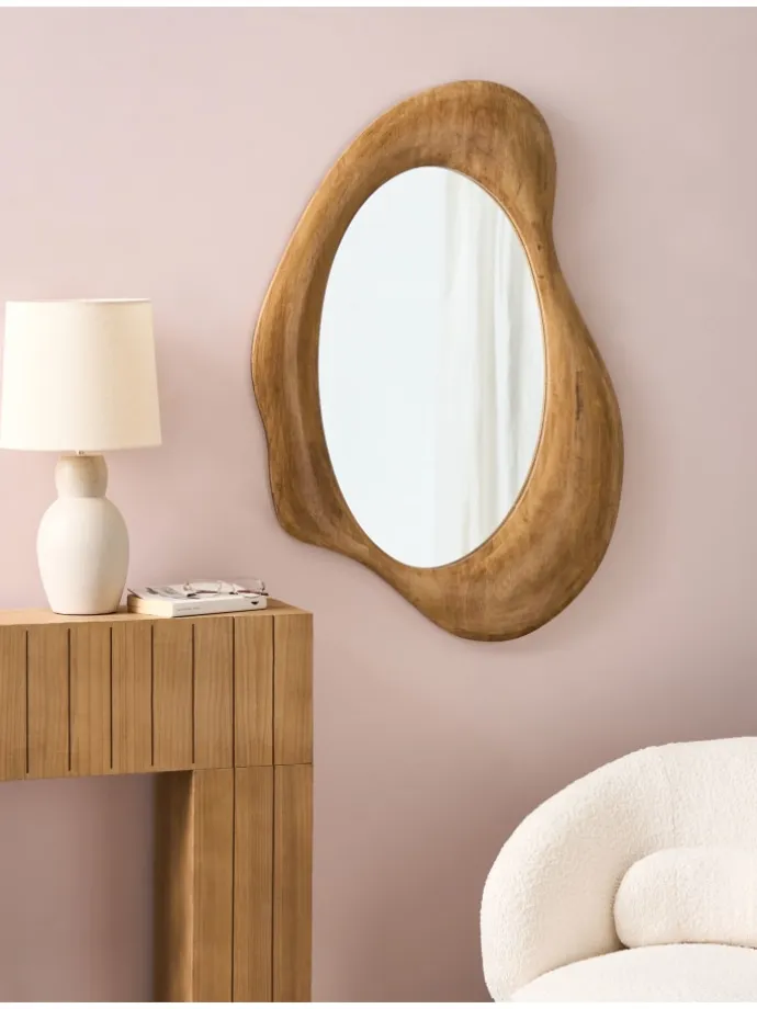 Moderner Dekospiegel aus Holz in asymmetrischer Form. Verleihen Sie Ihrem Zuhause mit diesem dekorativen Hängespiegel einen stilvollen Retro-Akzent. Der unregelmäßig geformte Rahmen aus robustem Gummibaumholz setzt einen besonderen Blickfang in jedem Raum. Die warme braune Farbgebung harmoniert mit unterschiedlichsten Einrichtungsstilen und sorgt für eine einladende Atmosphäre. Dank der integrierten Aufhängehaken lässt sich der Spiegel schnell und unkompliziert anbringen.