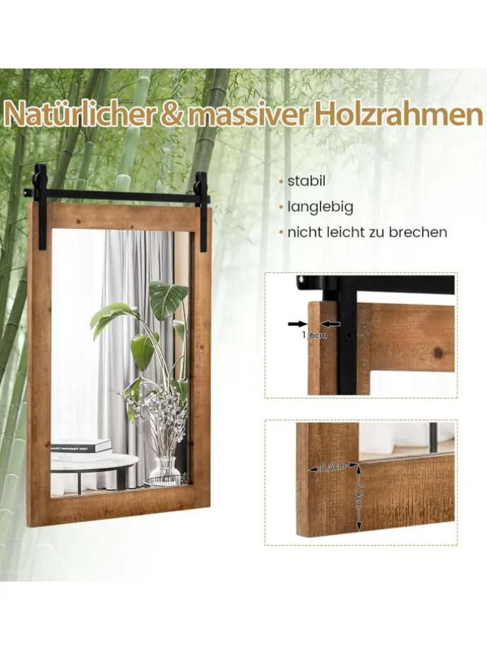 Dieser hochauflösende Spiegel mit explosionsgeschützter Schutzschicht sorgt nicht nur für klare Bilder ohne Verzerrung, sondern macht die Verwendung zu Hause auch sicherer. Der 76,5 x 56 cm große Wandspiegel ist in Massivholz gerahmt und sorgt so für hohe Stabilität und Langlebigkeit. Dieser rechteckige Wandspiegel im rustikalen Landhausstil passt fast überall in Ihr Zimmer und verleiht dem Raum eleganten Charme. Sie können den Spiegel an der Wand Ihres Wohnzimmers, Schlafzimmers, Badezimmers, Eingangsbereichs usw. montieren, um ihn als Kosmetikspiegel oder als Dekoration für Ihr Zuhause zu verwenden.