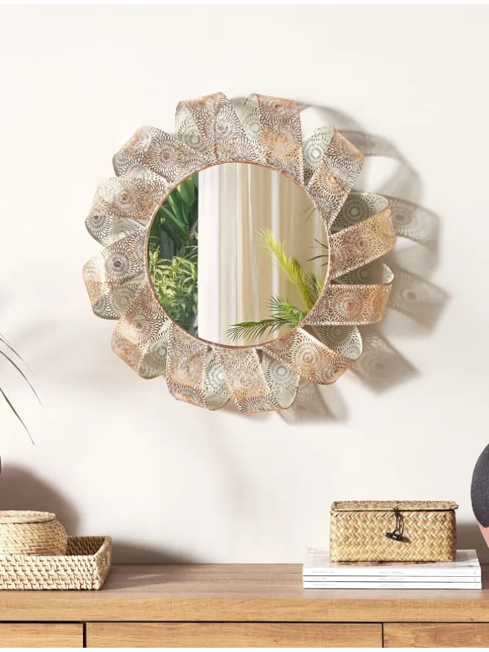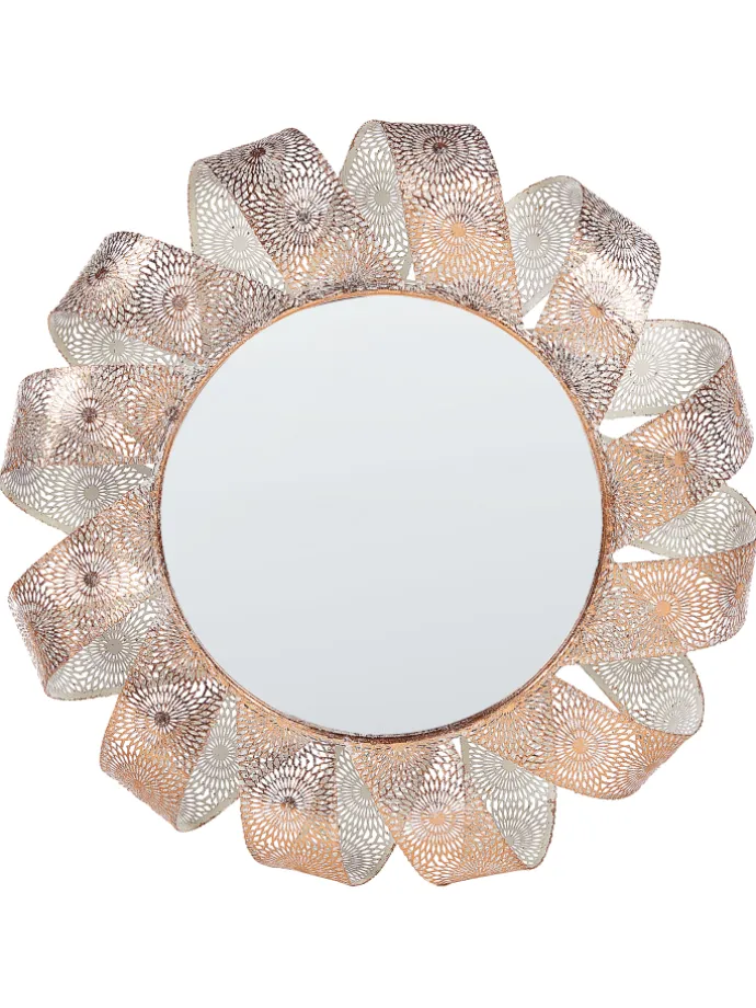 Wunderschöner Spiegel mit eleganter Ausstrahlung. Dieser schicke Wandspiegel mit gemustertem Rahmen ist eine perfekte Kombination von höchster Qualität und subtiler Eleganz. Gefertigt aus hochwertigem Glas und Metall, passt er ideal sowohl in romantische als auch in klassische Innenräume. Seine untypische Form erinnert an ein fließendes Schmuckband und lässt dieses Wohnaccessoire zum dekorativen Mittelpunkt des Raumes werden.