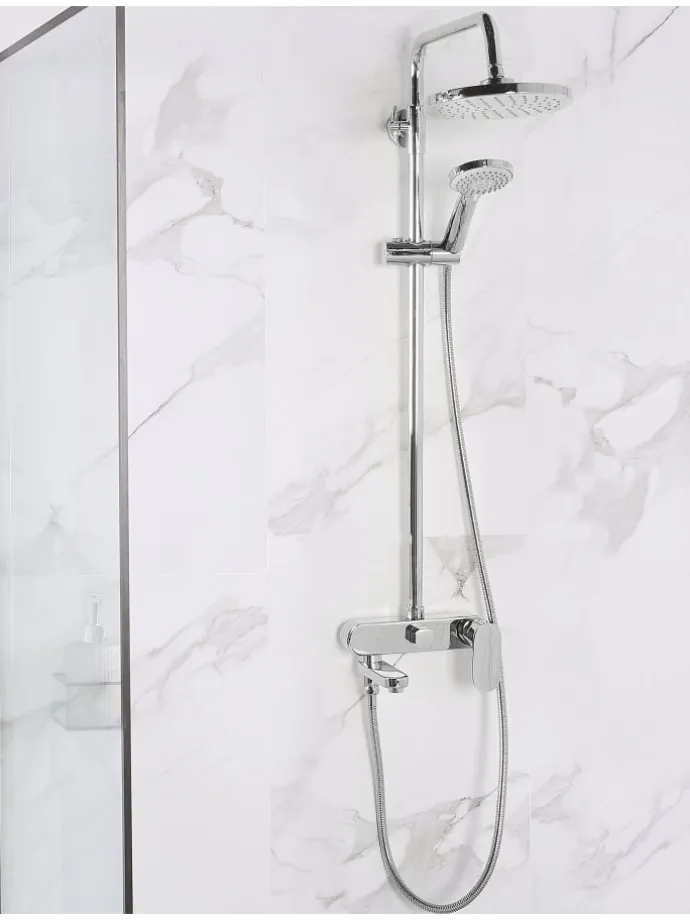 Praktische Handbrause, Passt zu Leitungen mit einem Standardgewinde G1/2, Überkopfbrause garantiert eine entspannende Regendusche mit breitem Wasserstrahl, 3 Strahlarten zur verschiedenen Anwendung, Verstellbare Duschstange zur Höhenanpassung, Integrierter Umsteller für einfaches Umschalten zwischen Regendusche, Wasserhahn und Handbrause, Regendusche mit verstellbarem Winkel, Integrierter Wannenauslauf, geeignet für Montage in der Dusche oder über der Badewanne