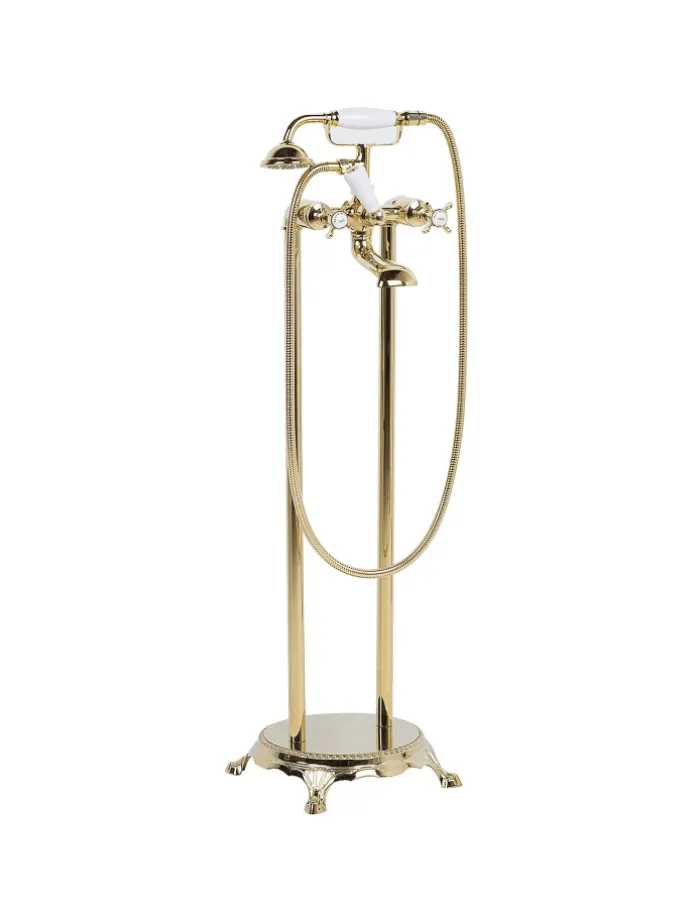 Freistehende Badewannenarmatur im Retro-Look. Diese Standarmatur mit zwei stylischem Griffen flutet jedes Bad mit Nostalgie-Flair. Dank der schönen Antikoptik strahlt sie sofort eine behagliche Gemütlichkeit aus. Der Wasserhahn ist komplett aus massivem, goldfarbenem Messing und Edelstahl gefertigt. Ein edler Hingucker für Ihr Wohlfühl-Badezimmer.