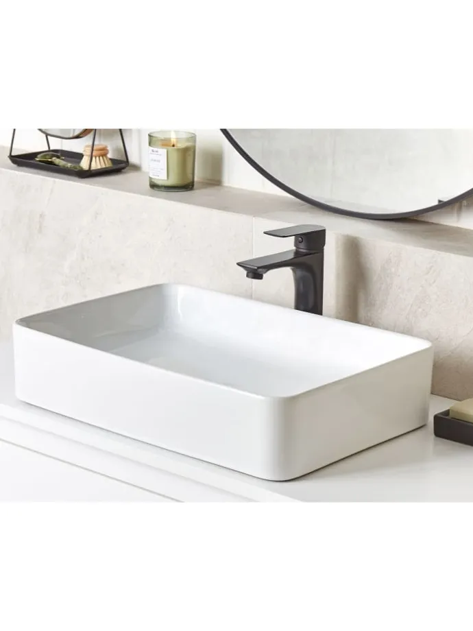 Rechteckiges, weißes Waschbecken ohne Überlauf. Erfüllen Sie Ihren gestalterischen Badezimmer-Traum und bereichern Sie Ihr Badeparadies mit diesem eleganten Aufsatzwaschbecken. Dieses tiefe Waschbecken verbindet eine schlichte, dennoch stilvolle Silhouette mit einer pflegeleichten Keramik-Oberfläche. Es steht Ihnen frei, die Waschschale nicht nur auf einem Schrank, sondern auch auf einer Kommode oder einem Tisch zu platzieren.