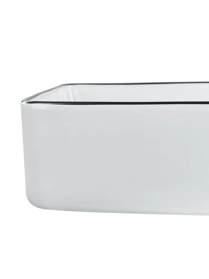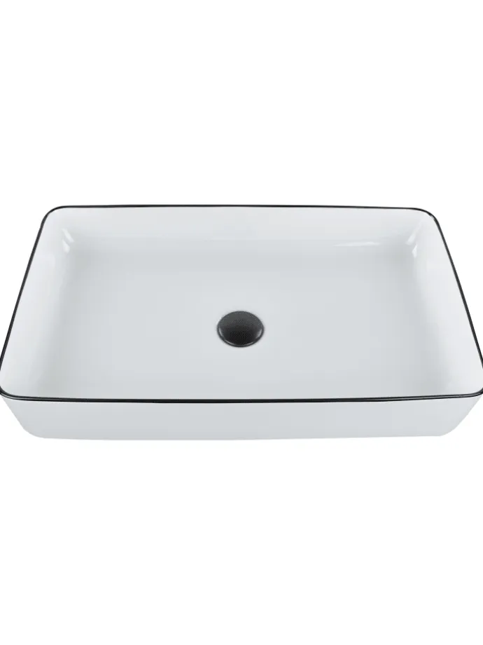 Rechteckiges Waschbecken ohne Überlauf. Lassen Sie Eleganz in Ihrem Badezimmer einziehen und setzen Sie auf den klassischen schwarz-weissen Farbkontrast dieses Aufsatzwaschbeckens. Das Waschbecken besteht vollständig aus pflegeleichter, langlebiger Keramik und ist in einer wunderschönen Schalenform gehalten, die durch einen schwarzen Rand ergänzt wird. Perfekt für moderne und traditionelle Einrichtungen.