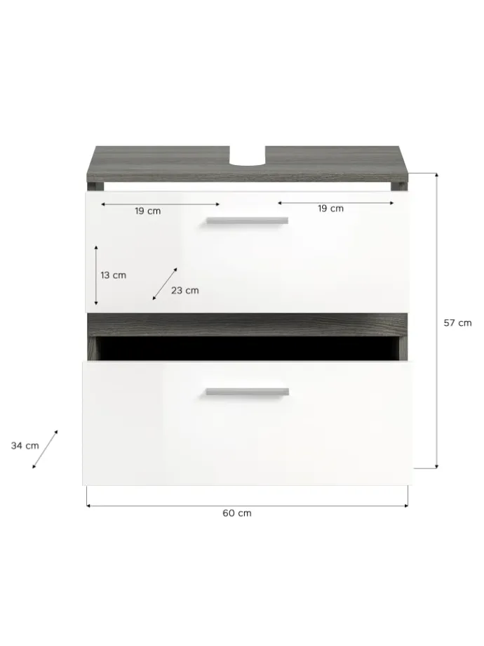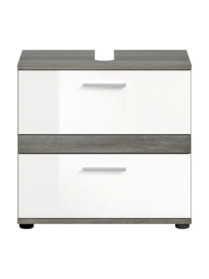 Entdecken Sie unseren Waschbeckenunterschrank mit den Maßen 60x57x34 cm in eleganter Rauchsilber-Nachbildung und strahlendem Weiß-Hochglanz-Finish. Mit seinem stilvollen Design und großzügigem Stauraum ist dieser Schrank die ideale Ergänzung für Ihr Badezimmer. Eine perfekte Kombination aus Ästhetik und Funktionalität.