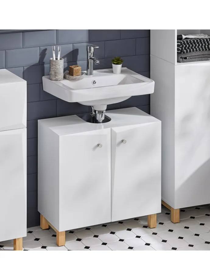 Der Schrank bietet, dank der Aussparung für den Siphon, die Möglichkeit, diesen unterhalb des Waschbeckens zu platzieren und somit den störenden Bauteilen zu verkleiden.