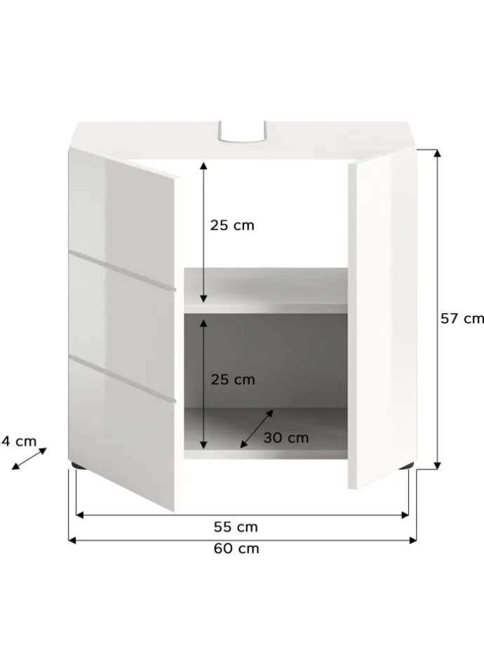 Erweitere dein Badezimmer mit unserem stylischen Waschbeckenunterschrank in weißem Melamin und weißem Hochglanz tiefgezogenem Finish. Mit seinen kompakten Maßen passt er perfekt unter dein Waschbecken und bietet dennoch ausreichend Stauraum für deine Badutensilien. Verleihe deinem Badezimmer mit diesem modernen Möbelstück einen Hauch von Eleganz und funktionaler Raffinesse