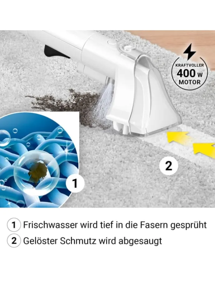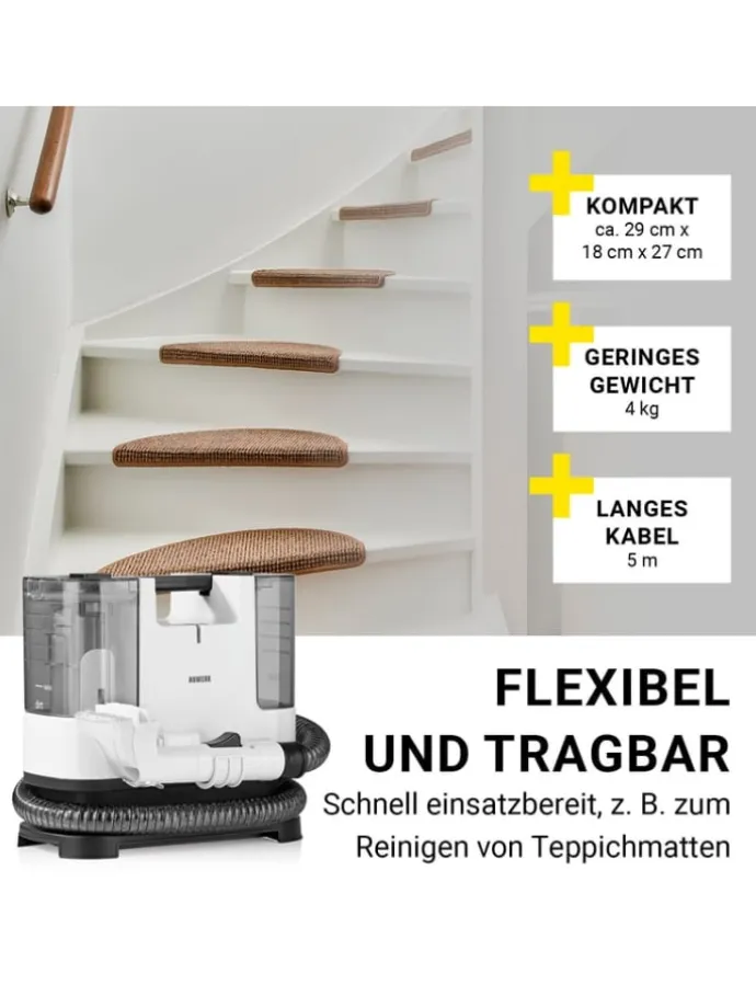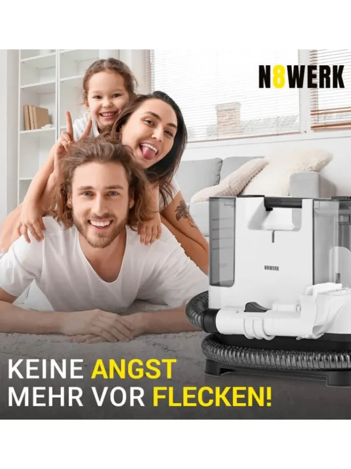 So einfach waren Polster- und Teppichreinigung noch nie: Der N8WERK Polster- & Teppichreiniger ist dank kompaktem Design flexibler als andere Reiniger und trägt auch noch die volle Anti-Flecken-Power in sich. Mit seinem cleveren Doppeltank-System, welches Schmutz- und Frischwasser voneinander trennt, eignet er sich perfekt für optimierte Reinigungsabläufe bei dir zu Hause. Ob es um die Reinigung deines Sofas, der Autositze oder Teppiche geht: Der N8WERK Polster- & Teppichreiniger kommt mit zwei Düsen, davon einer mit Bürstenaufsatz, und praktischer Sprühfunktion, damit kein Fleck mehr zurückbleibt. Bewahre somit künftig die Ruhe, wenn mal etwas daneben geht, denn Haustier-, Rotwein-, Schokoladen- und viele weitere Flecken haben ab sofort keine Chance mehr! Flecken einfach einsprühen, reinigen und bequem aufsaugen – fertig! Hol dir das kompakte Multi-Talent für tiefenreine Fasern im gesamten Haushalt: den N8WERK Polster- & Teppichreiniger – einfach verstaubar und mit einer starken Sprühleistung von 400 ml pro Min. Inkl. 500 ml Reinigungsmittel, flexiblem 1,2 m Schlauch und 5 m Kabel.