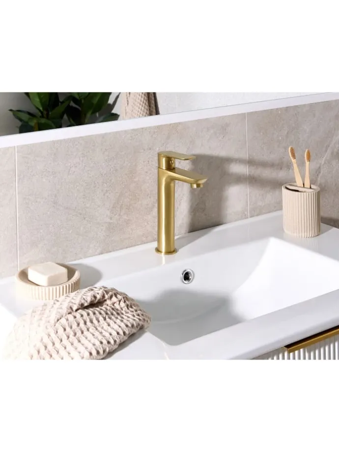 Eleganter matter Einhebel-Wasserhahn. Diese elegante Waschbeckenarmatur vereint modernes Design mit hoher Funktionalität. Gefertigt aus hochwertigem Messing mit matter Oberfläche, verleiht sie dem Badezimmer eine stilvolle Note. Der minimalistische Look und benutzerfreundliche Hebel ermöglichen eine präzise und komfortable Regulierung von Wasserdruck und Temperatur.