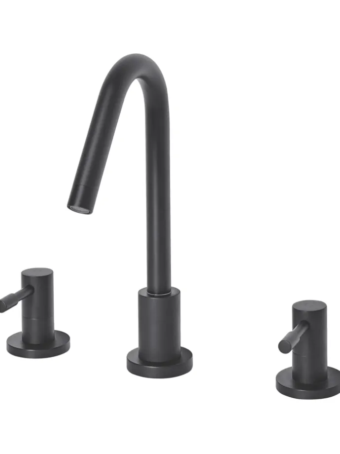 3-Loch-Waschbeckenarmatur im trendigen Schwarz. Diese klassische Armatur verbindet Funktionalität, Qualität und Design. Der schmale und geschwungene Auslauf passt sowohl zu schlichten und kantigen Waschbecken, als auch zu abgerundeten und dezenten Formen, womit diese Garnitur eigentlich alle Einrichtungsstile optisch aufwertet. Dank der zwei dazugehörigen separaten Griffe können Sie mit Leichtigkeit die gewünschte Wassertemperatur und Auslaufstärke einstellen.