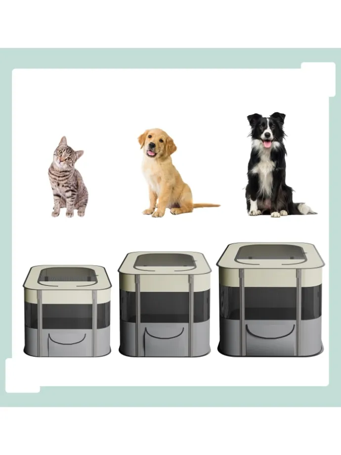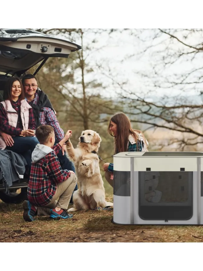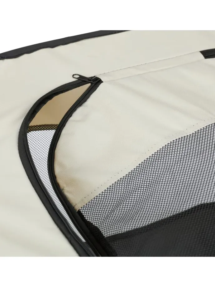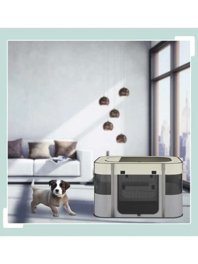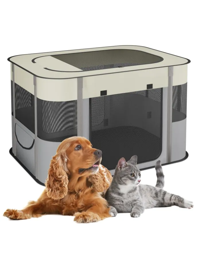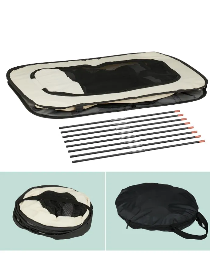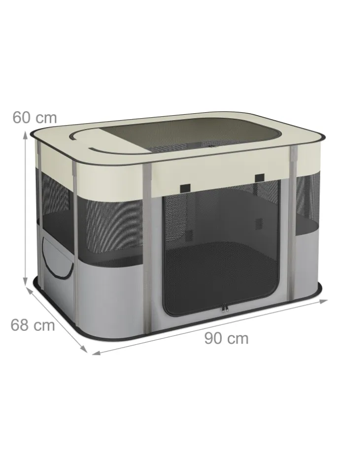Biete Deinem Welpen mit diesem Hundestall einen sicheren Ort zum Spielen, Fressen und Schlafen. Das Hundezelt für innen und außen besitzt 3 große Reißverschlussöffnungen, die Meshfenster sorgen für optimale Belüftung. Der Kittenlaufstall aus robustem Oxford-Gewebe ist im Handumdrehen aufgestellt und gefaltet in der Tragetasche der ideale Begleiter für Garten, Park oder Camping.