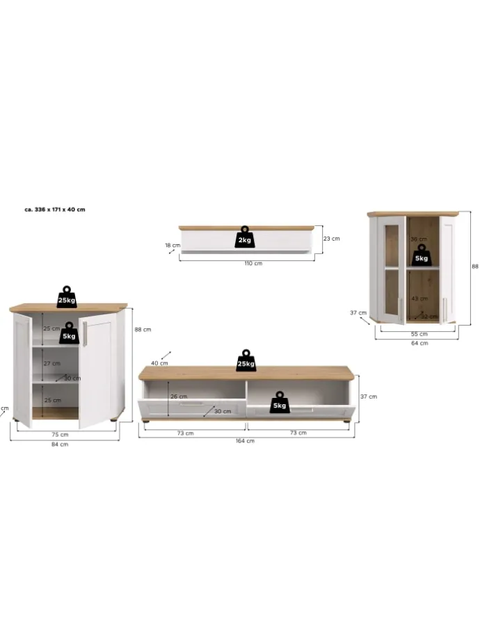 Sichern Sie sich Ordnung und Stil mit unserer praktischen 4-teiligen Wohnkombination! Sie umfasst ein Highboard, ein Lowboard, ein Wandboard und eine kleine Vitrine. Die hochwertige Verarbeitung und der landhaus-inspirierte Look mit farblich abgesetzten Ober- und Unterböden lassen Ihr Wohnzimmer strahlen. Ideal für alle, die Funktionalität und Eleganz verbinden möchten.