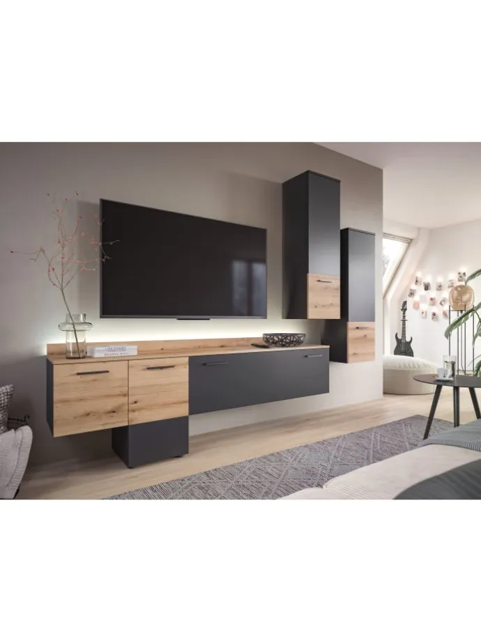 Unsere geräumige Wohnwand in stilvollem Grau-Nachbildung bietet eine perfekte Lösung für Ihr Wohnzimmer. Mit großzügigen Abmessungen von 247x196x37 cm schafft sie nicht nur ausreichend Stauraum, sondern setzt auch moderne Akzente in Ihrem Zuhause. Entdecken Sie jetzt die perfekte Kombination aus Funktionalität und zeitlosem Design für ein stilvolles Wohnambiente.