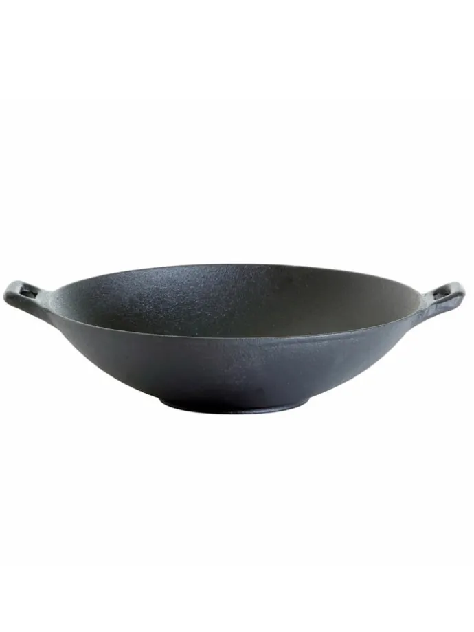 Wok aus Gusseisen – Wokpfanne mit 2 Griffen – D: 37cm Gusseisen ist ein perfekter Wärmespeicher und gibt die Hitze sehr gut an die Lebensmittel ab. Deshalb werden WOK Pfannen aus Guss gerne auf dem Grill eingesetzt. Nicht nur für traditionell asiatische Gerichte, also Kurzgebratenes, sondern auch gerne für Geschnetzeltes in Sahnesauce, Gemüsepfannen, Pilzpfannen etc.