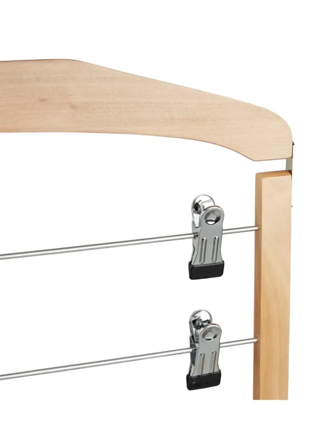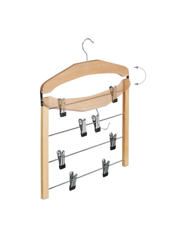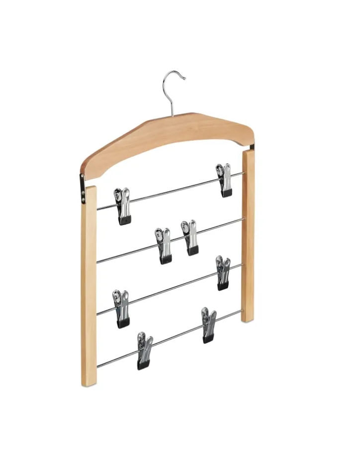 Sie haben nicht viel Platz in Ihrem Kleiderschrank, besitzen aber einige Röcke und Hosen, die ordentlich aufbewahrt werden sollen? Dann ist dieser vielseitige Kleiderbügel ideal. Er verfügt über 4 Stangen mit jeweils 2 Metallklammern, die sich nach Bedarf verschieben oder drehen lassen. Die hochwertig verarbeiteten Clips greifen sehr fest zu und sind zudem gummiert, sodass Sie keinerlei Abdrücke auf Ihren Sachen hinterlassen. Dank des Rockbügels bewahren Sie Ihre Kleidungsstücke unkompliziert und knitterfrei auf.