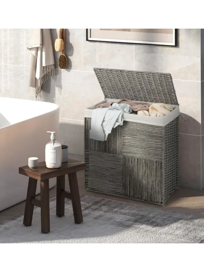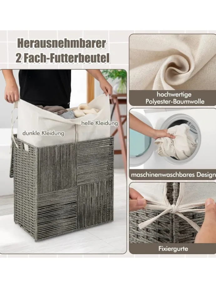 Dieser Wäschekorb aus hochwertigem PP-Rattan mit hoher Haltbarkeit verspricht eine lang anhaltende Nutzung. Der robuste Metallrahmen sorgt für Stabilität und trägt bis zu 45 kg. Darüber hinaus halten die erhöhten Fußpolster den Wäschekorb vom Boden fern. Mit separaten Bereichen im Innenfutterbeutel können Sie Ihre Kleidung klassifizieren. Der Innenfutterbeutel kann herausgezogen und bei Bedarf maschinengewaschen werden. Wenn Sie diesen Wäschekorb bewegen müssen, bieten die praktischen Griffe Bequemlichkeit. Bei Nichtgebrauch kann er einfach zusammengeklappt und verstaut werden.