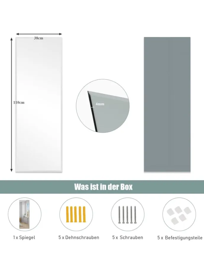 Verschönern Sie Ihren Wohnraum mit unserem 110 x 38 cm großen Wandspiegel! Dieser rahmenlose große Wandspiegel verfügt über ein einfaches und klassisches Design, das Ihr Zuhause geschmackvoll aussehen lässt. Der Ganzkörperspiegel mit hochauflösender Bildgebung bietet Ihnen großen Komfort, sich vor dem Spiegel anzuziehen. Er kann nicht nur als Schminkspiegel verwendet werden, sondern kann auch ein atemberaubendes Schmuckstück für verschiedene Anlässe sein, z. B. für Schlafzimmer, Wohnzimmer, Flur, Studio, Friseursalon, Gästetoilette, Friseursalon usw. Dieser gut verarbeitete Mehrschichtspiegel mit bruchsicherer Folie sorgt nicht nur für eine dauerhafte Nutzung, sondern macht ihn auch sicher in der Anwendung. Mit der ausführlichen Anleitung können Sie den Spiegel ganz einfach vertikal oder horizontal an der Wand montieren.