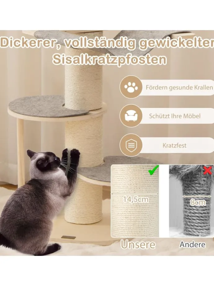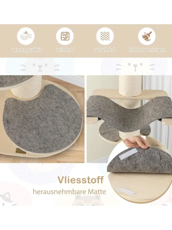 Das All-in-One-Katzenaktivitätszentrum verfügt über einen weichen Sitz mit Sisalteppich. So können Katzen nicht nur erholsam schlafen, sondern auch ihre Krallen schärfen. Außerdem sind die 14,5 cm dicken Sisalstämme robust und kratzfest, was eine perfekte Lösung zum Schutz Ihrer Möbel darstellt. Mit 2 gepolsterten Sprungplattformen können Katzen problemlos auf und ab springen. Und die abnehmbare Hängematte bietet Katzen einen weiteren Platz zum Ausruhen. Sowohl die Hängematte als auch die rutschfesten Pads bestehen aus reißfestem Vliesstoff und sorgen für ein atmungsaktives Erlebnis. Der 4-stöckige Katzenturm verfügt über eine breite Basis und 6 rutschfeste Pads für überragende Stabilität.