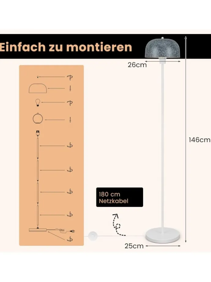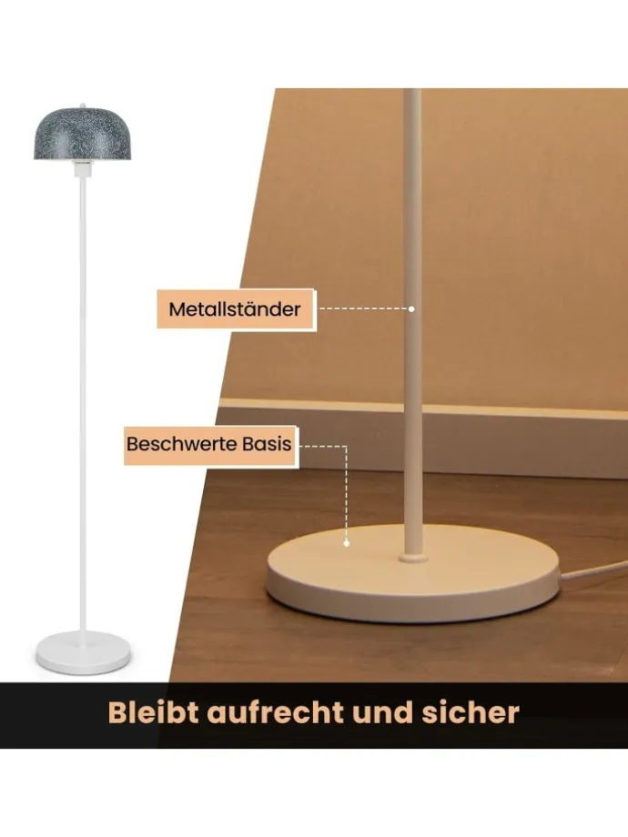 Werten Sie Ihr Zuhause mit unserer Stehleuchte auf und genießen Sie ihr raffiniertes Design und ihre praktischen Funktionen! Mit ihrem schlanken Design und dem eleganten Lampenschirm ist diese Stehlampe die perfekte Ergänzung für jeden Raum. Und dank des praktischen Fußschalters können Sie das Licht problemlos ein- und ausschalten. Die E27-Fassung ermöglicht die Anpassung der Glühbirne (nicht im Lieferumfang enthalten) und gibt Ihnen die Freiheit, Ihr gewünschtes Ambiente zu schaffen. Darüber hinaus bietet Ihnen das 180 cm lange Netzkabel Flexibilität bei der Platzierung der Lampe, während der beschwerte Sockel für Stabilität und Sicherheit sorgt. Diese vielseitige Stablampe eignet sich nicht nur für das Wohnzimmer, sondern auch für das Schlafzimmer, das Büro oder jeden anderen Ort, an dem Sie Stil und Funktionalität benötigen.
