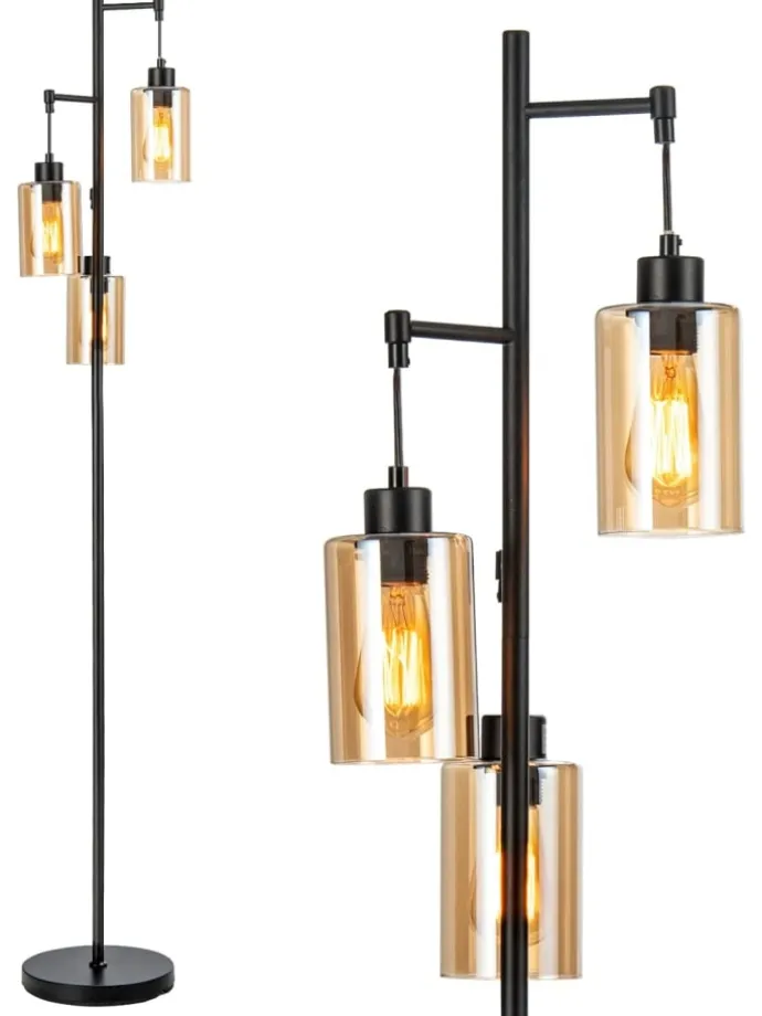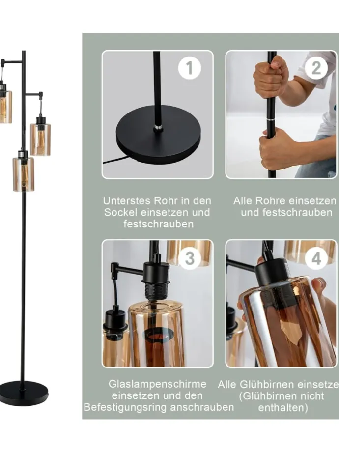 Unsere 3-Kopf Stehlampe kann Ihnen eine angenehme Lern- und Arbeitsumgebung bieten. Mit ihren 3 Bernsteinglaslampenschirmen schützt die Stehlampe Ihre Augen vor Verletzungen durch direktes Licht. Außerdem macht das Fußschalter-Design das Ein- und Ausschalten des Lichts einfach. Der solide Eisenrahmen sorgt für Stabilität und Standfestigkeit während des Gebrauchs. Darüber hinaus macht ihr Retro- und Eleganz-Stil sie geeignet für verschiedene Orte wie Wohnzimmer, Schlafzimmer, Esszimmer usw. Ihr 1,8 Meter langes Stromkabel hilft Ihnen zudem, die Lampe dort zu verwenden, wo Sie möchten. Dank der detaillierten Anleitung und aller notwendigen Zubehörteile ist sie einfach zu montieren.