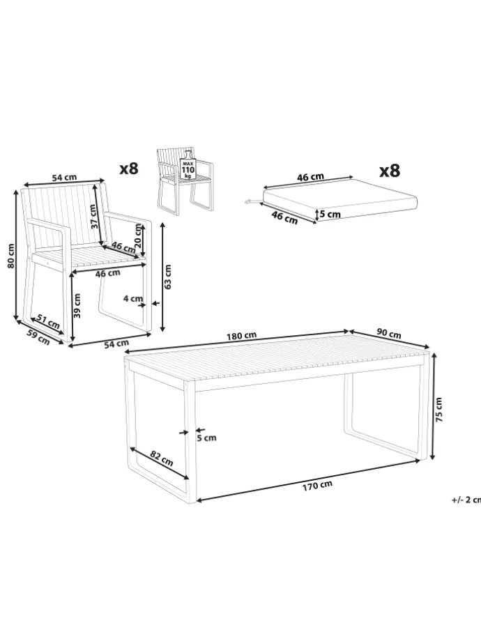 Sie kaufen: 1 x Tisch, 8 x Stühle, 8 x Sitzkissen