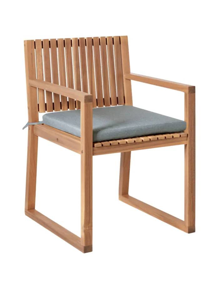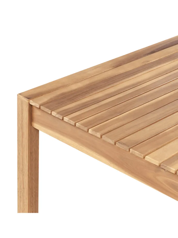 Moderner, rechteckiger Gartentisch mit 8 Stühlen und passenden Sitzkissen. Ein Gartenset aus robustem zertifiziertem Akazienholz ist genau das, was Sie für sonnige Sommertage und gemütliche, warme Abende unter freiem Himmel brauchen. An diesem praktischen Tisch finden bis zu 8 Personen einen bequemen Sitzplatz, perfekt für Freunde und Familie. Die gradlinige und zugleich ausgefallene Formgebung der schrägen Rückenlehnen, die Gestaltung der Sitze sowie die Stuhl- und Tischbeine in Kufenform unterstreichen das trendy Design. Dank der hochwertigen Fertigung sind die Leinenoptik-Sitzkissen UV-beständig. Mithilfe der Bindebänder kann man sie sicher am Stuhl fixieren, um ein bequemes Sitzerlebnis zu gewährleisten. Die integrierten Reißverschlüsse haben eine rein dekorative Funktion.