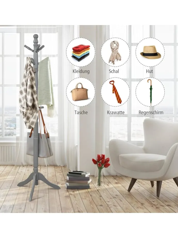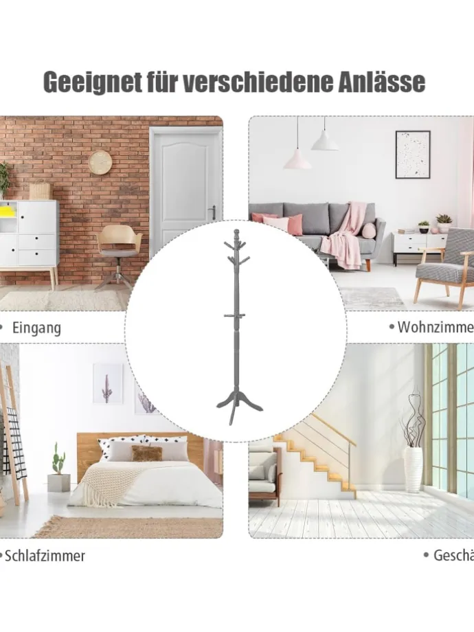 Unsere freistehende Garderobe ist eine gute Wahl, um einen praktischen Platz zum Aufhängen häufig verwendeter Utensilien zu schaffen. Die aus Naturkautschukholz gefertigte Garderobe ist robust und verschleißfest für den Langzeitgebrauch. Und die dreibeinige Basis sorgt für gute Stabilität. Mit 9 versetzten Haken hilft es Ihnen, Ihre Kleidung, Schals, Taschen und andere Gegenstände organisiert zu halten, anstatt ein Durcheinander zu verursachen. Der Garderobenständer ist mit 4 unabhängigen und verstellbaren Abschnitten ausgestattet, die Sie je nach gewünschter Höhe frei installieren können. Und sie lassen sich ganz einfach und ohne Werkzeug zusammenbauen. Er kann nicht nur Komfort in Ihren Alltag bringen, sondern auch Ihrem Zimmer Schönheit verleihen. Er ist sowohl für Zuhause als auch für das Büro perfekt.