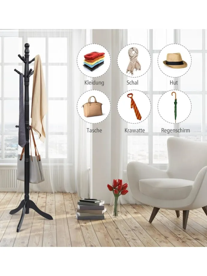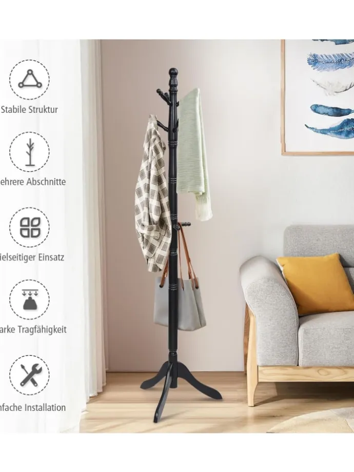 Unsere freistehende Garderobe ist eine gute Wahl, um einen praktischen Platz zum Aufhängen häufig verwendeter Utensilien zu schaffen. Die aus Naturkautschukholz gefertigte Garderobe ist robust und verschleißfest für den Langzeitgebrauch. Und die dreibeinige Basis sorgt für gute Stabilität. Mit 9 versetzten Haken hilft es Ihnen, Ihre Kleidung, Schals, Taschen und andere Gegenstände organisiert zu halten, anstatt ein Durcheinander zu verursachen. Der Garderobenständer ist mit 4 unabhängigen und verstellbaren Abschnitten ausgestattet, die Sie je nach gewünschter Höhe frei installieren können. Und sie lassen sich ganz einfach und ohne Werkzeug zusammenbauen. Er kann nicht nur Komfort in Ihren Alltag bringen, sondern auch Ihrem Zimmer Schönheit verleihen. Er ist sowohl für Zuhause als auch für das Büro perfekt.