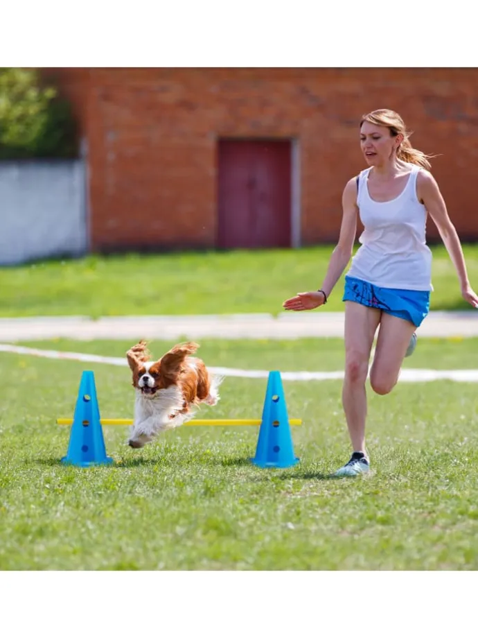 Dieses vielseitige Steckhürdenset mit 12 Kegeln und 6 Stangen ist sowohl für Tiere als auch für Menschen geeignet. Nutze die Steckhürden für Agility-Übungen mit Deinen Hunden oder zum Fitness- und Ausdauertraining für diverse Ball- bzw. Mannschaftsportarten. Die Stangen lassen sich für unterschiedliche Schwierigkeitsgrade auf 3 Höhen und in 4 Richtungen einstecken. Das Agility-Set ist aus robustem Kunststoff gefertigt und kann auf Wiese und Sportplatz oder in der Turnhalle verwendet werden.